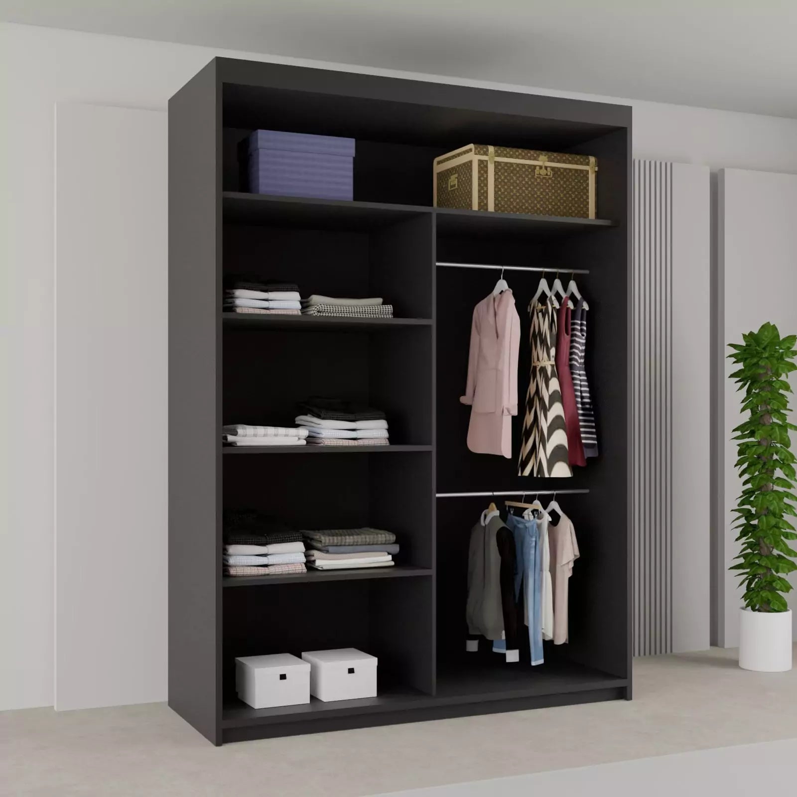 Our wardrobes feature varying numbers of shelves depending on the size, providing ample space for all your clothing needs. The dedicated hanging section is perfect for keeping your neatly ironed clothes wrinkle-free and easily accessible.
